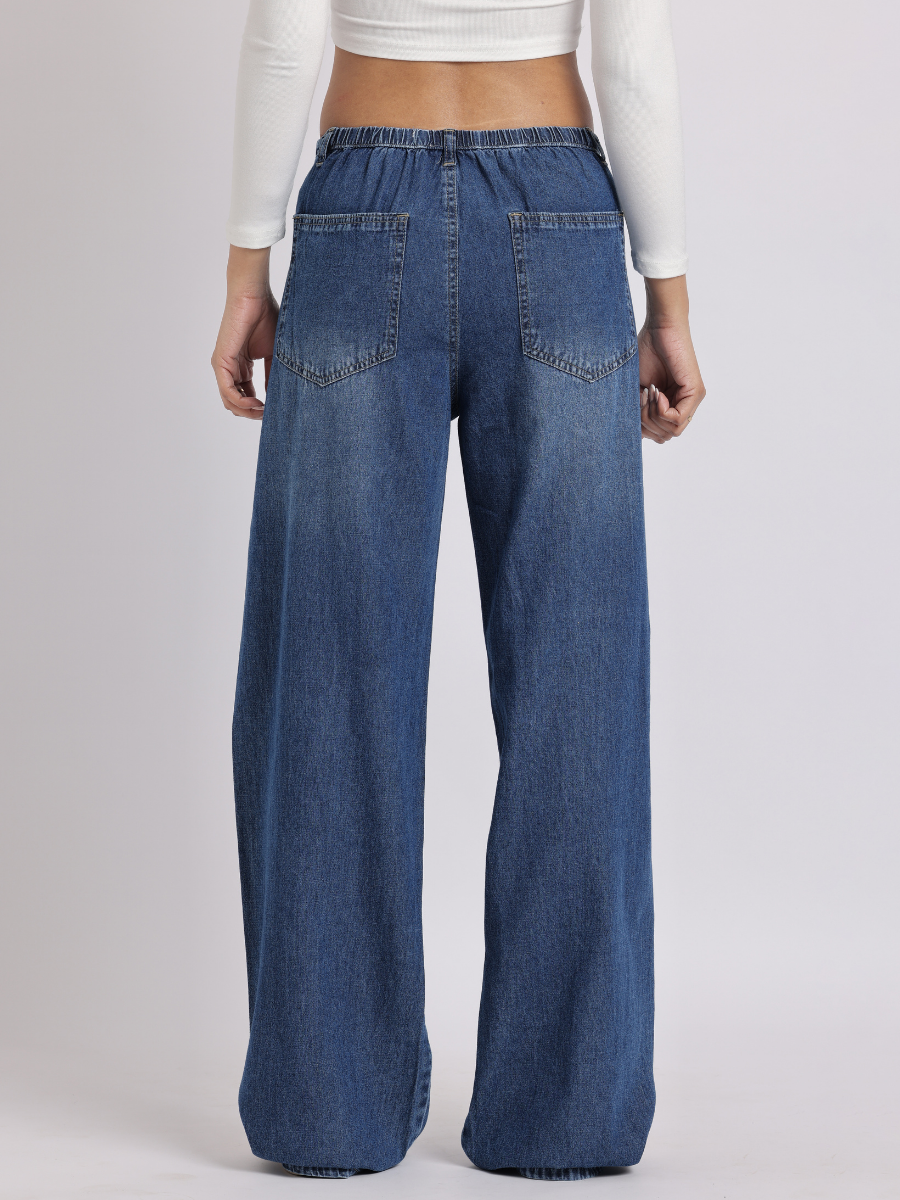 Blue Drawstring Waist Wide-Leg Denim Jeans