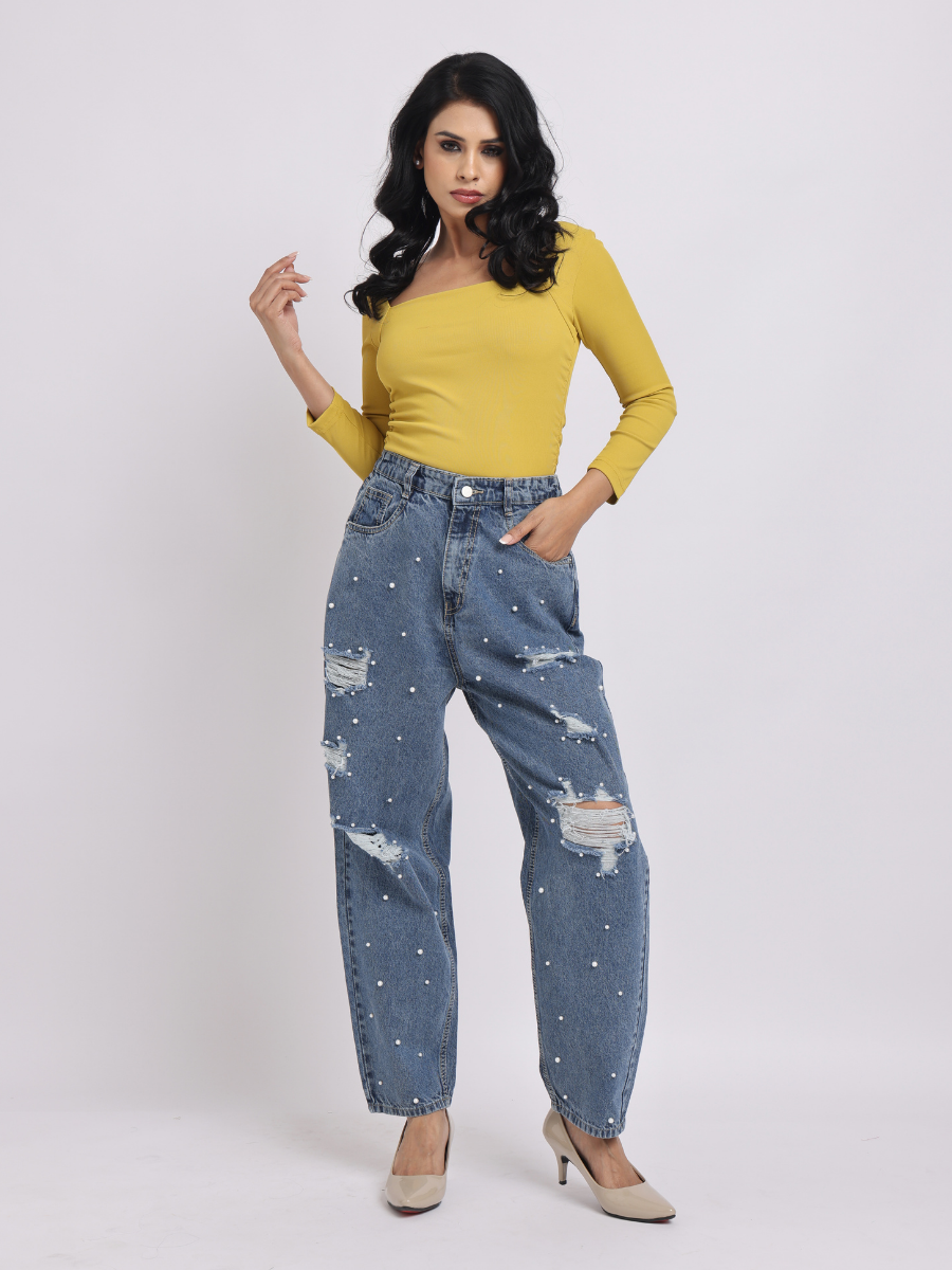 - Pair these jeans with a fitted top or tucked-in blouse to balance the relaxed fit. Add heels or pointed flats for a polished look, or sneakers for casual chic vibes.