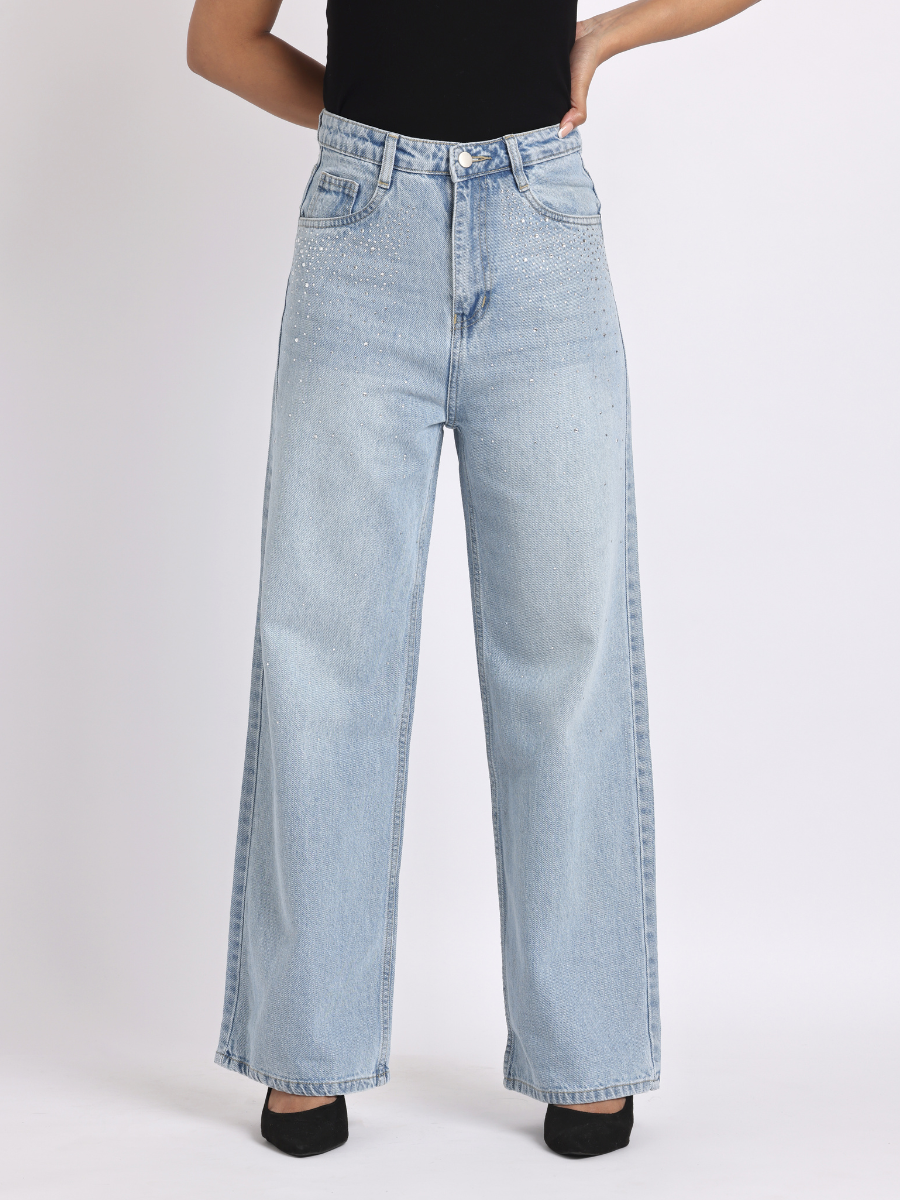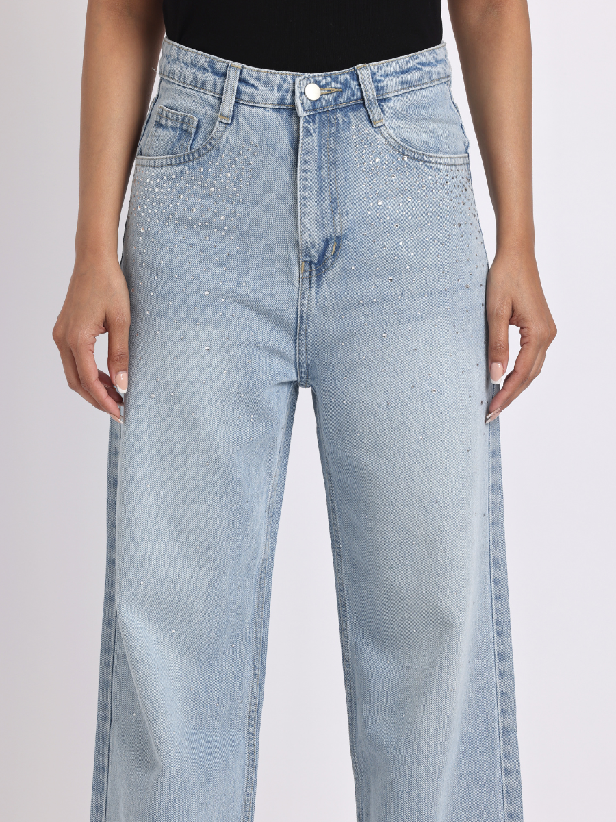 Light Blue Rhinestone-Embellished Wide-Leg Denim Jeans