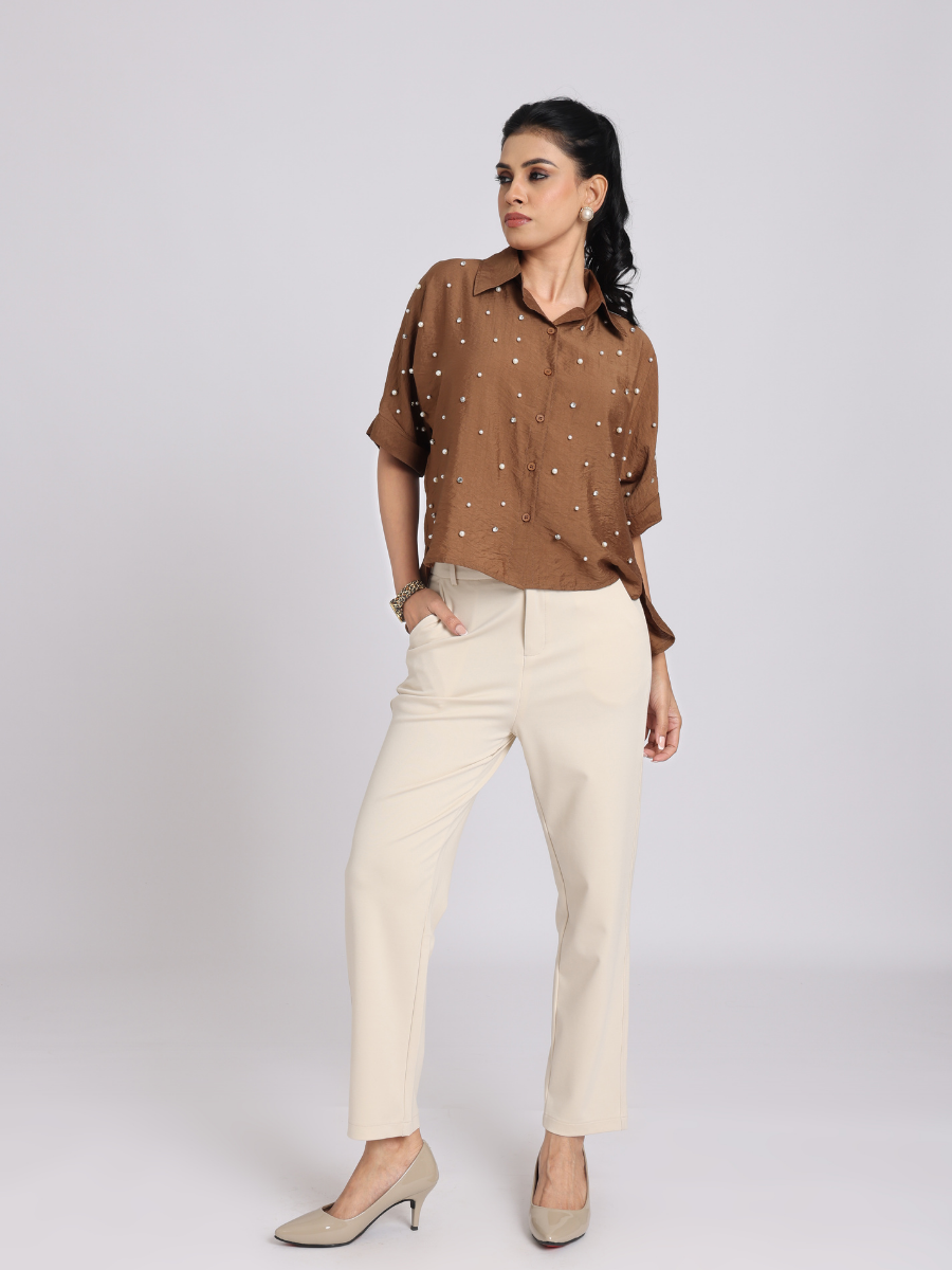 Cocoa Brown Pearl-Diamond Oversized Shirt