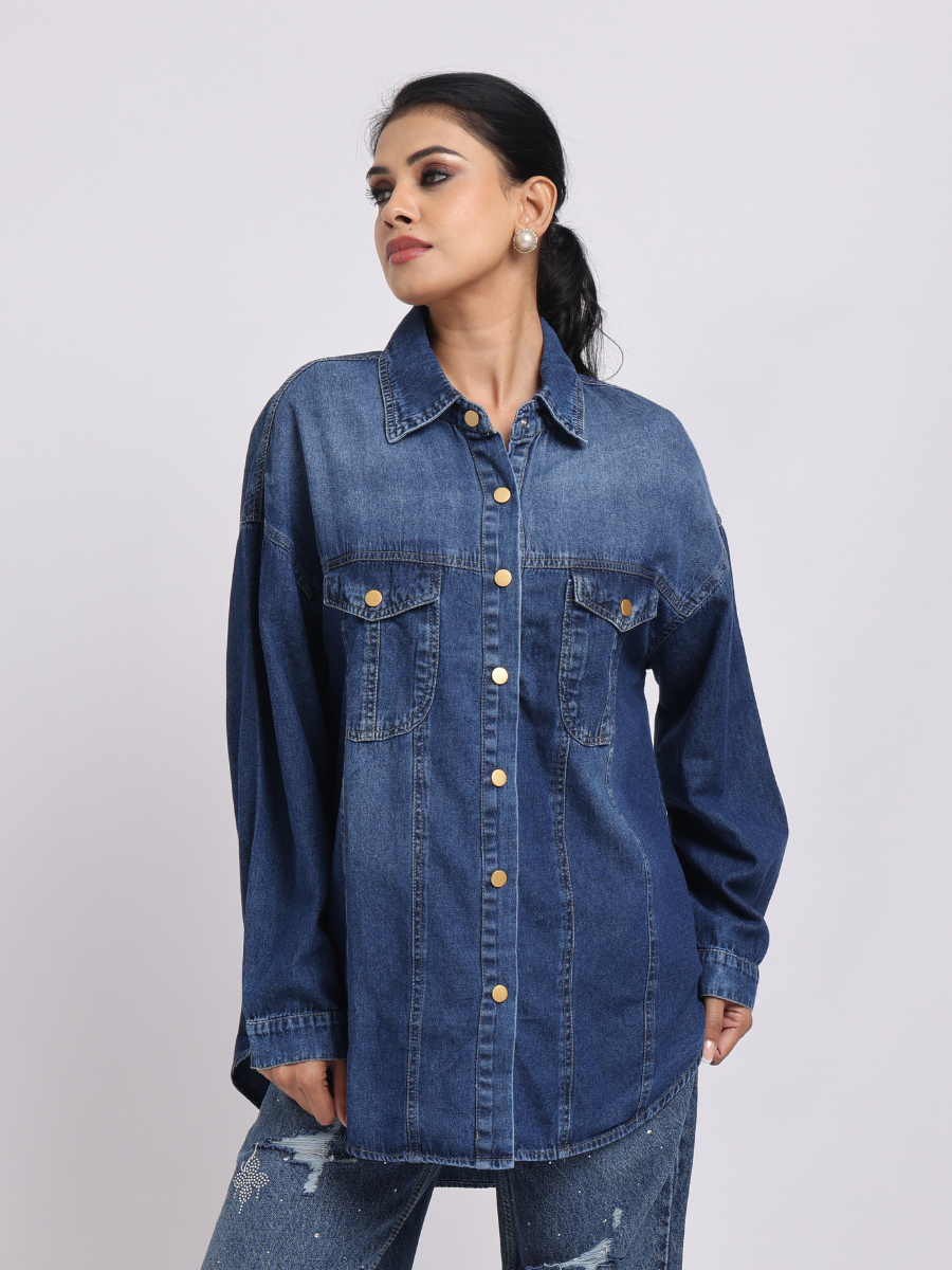 - Oversized denim shirt with a relaxed, street-style silhouette