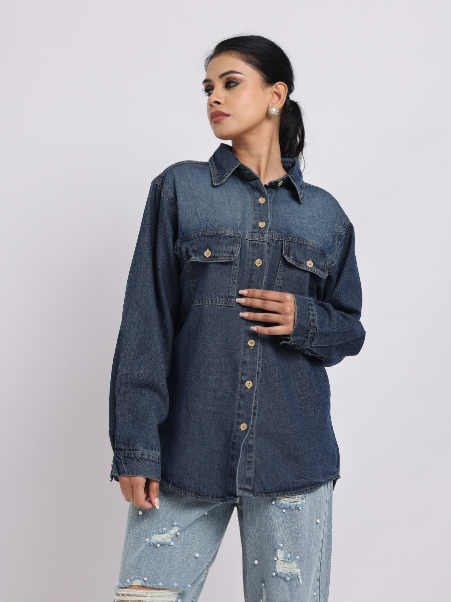 - Classic Dark-blue denim shirt with a relaxed, oversized silhouette