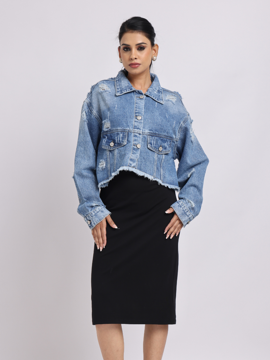 - Pair this cropped denim jacket with high-waisted jeans, skirts, or fitted dresses to highlight the waistline. Finish the look with sneakers for a casual vibe or heels for a chic street-style outfit.