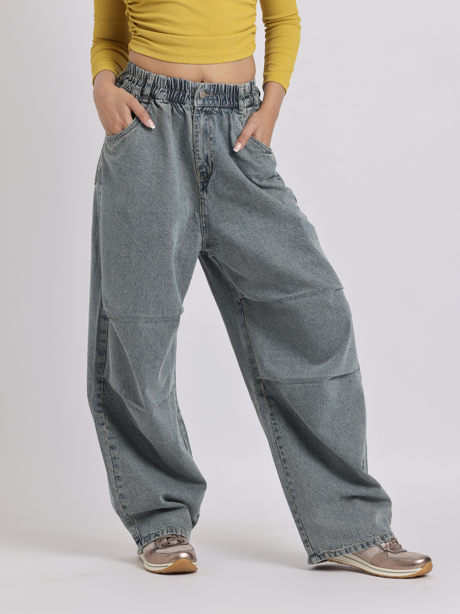 Grey Elastic Waist Wide-Leg Denim Jeans