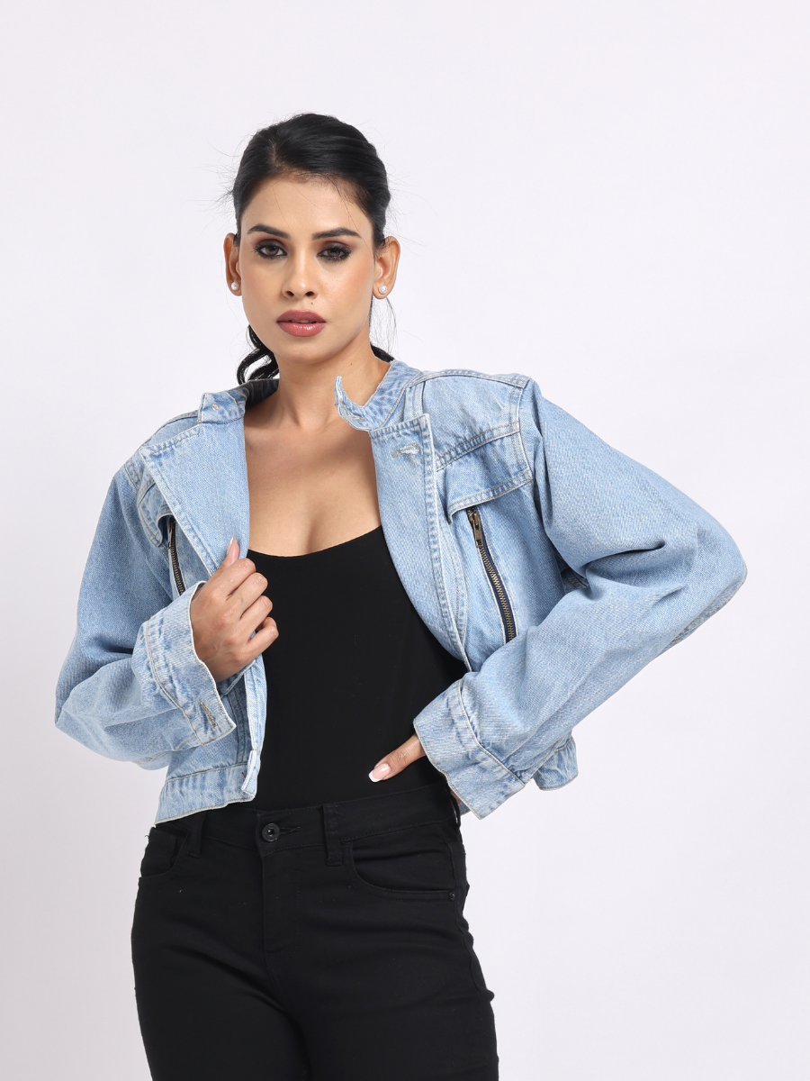 Light Blue Cropped Denim Jacket with Zip Detail