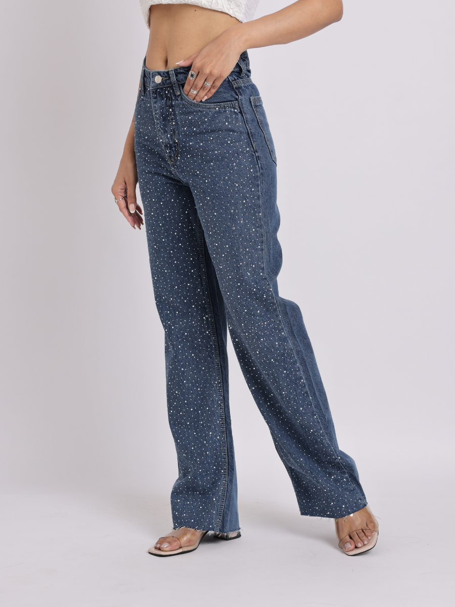 - Style: Classic straight-fit denim jeans with all-over crystal stud detailing