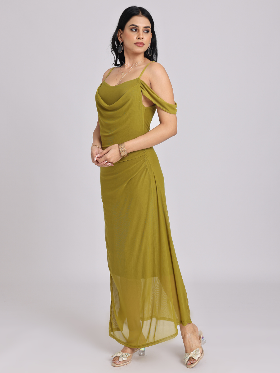 - Pair this chic olive maxi dress with gold statement earrings, a sleek bracelet, and strappy heels to elevate the look for a night out.