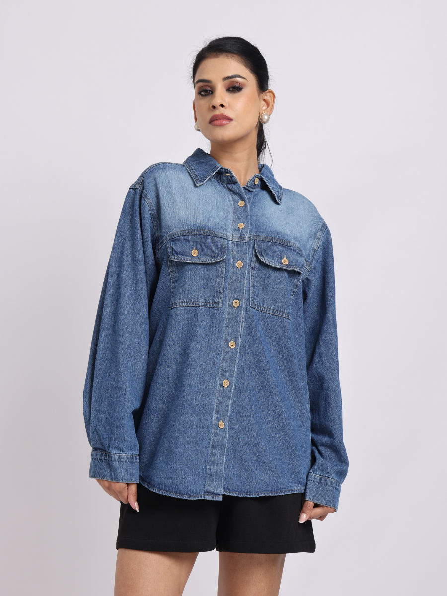 - Classic mid-blue denim shirt with a relaxed, oversized silhouette