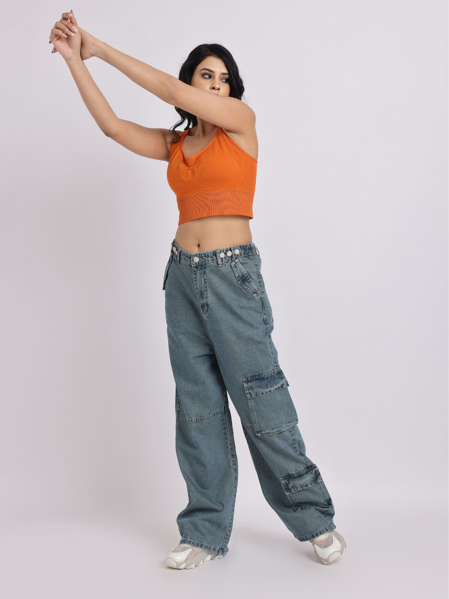 - Pair these wide-leg cargo jeans with a fitted crop top or tucked-in tank for a balanced silhouette. Complete the look with sneakers or chunky sandals for an effortless streetwear vibe.